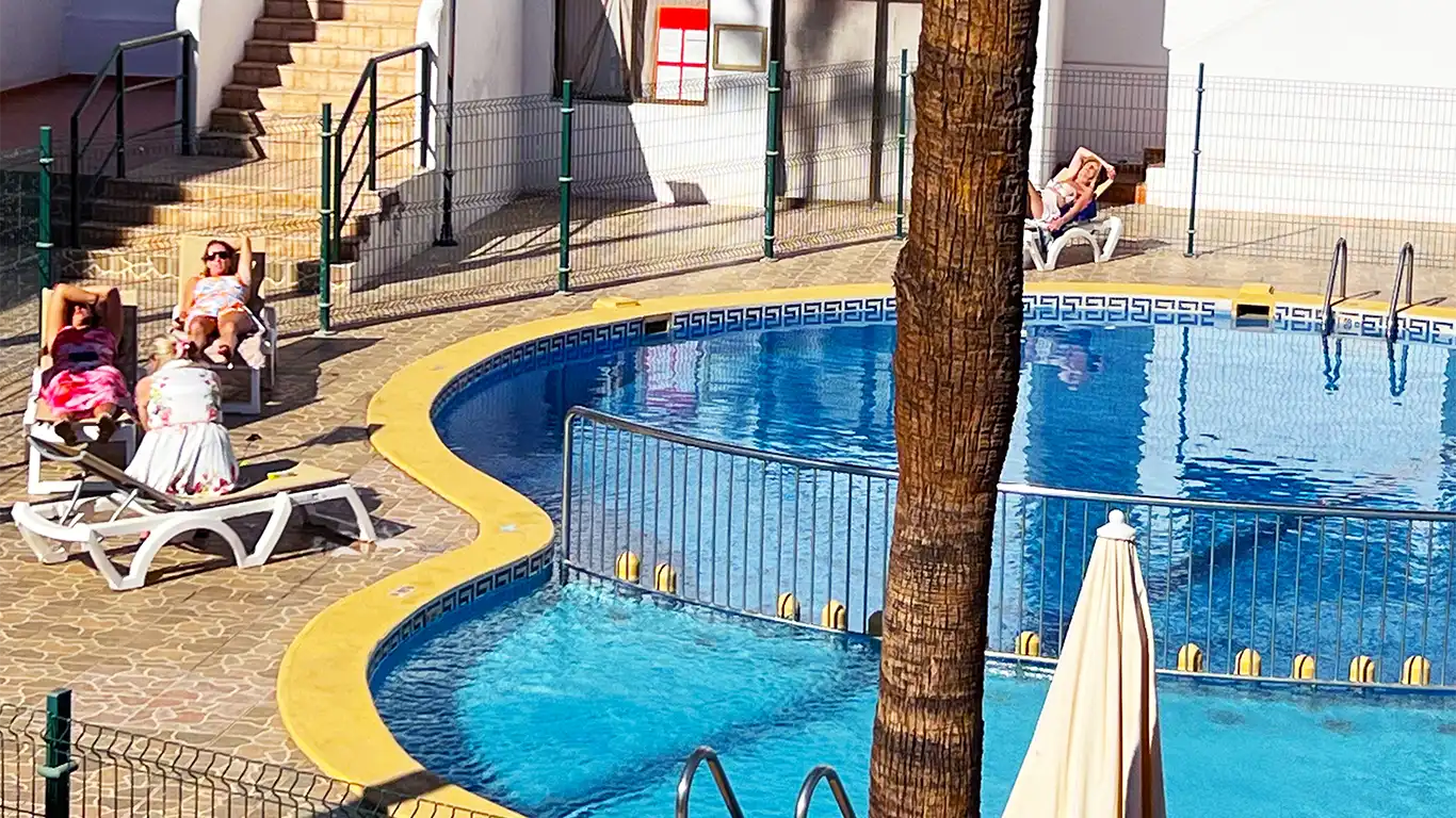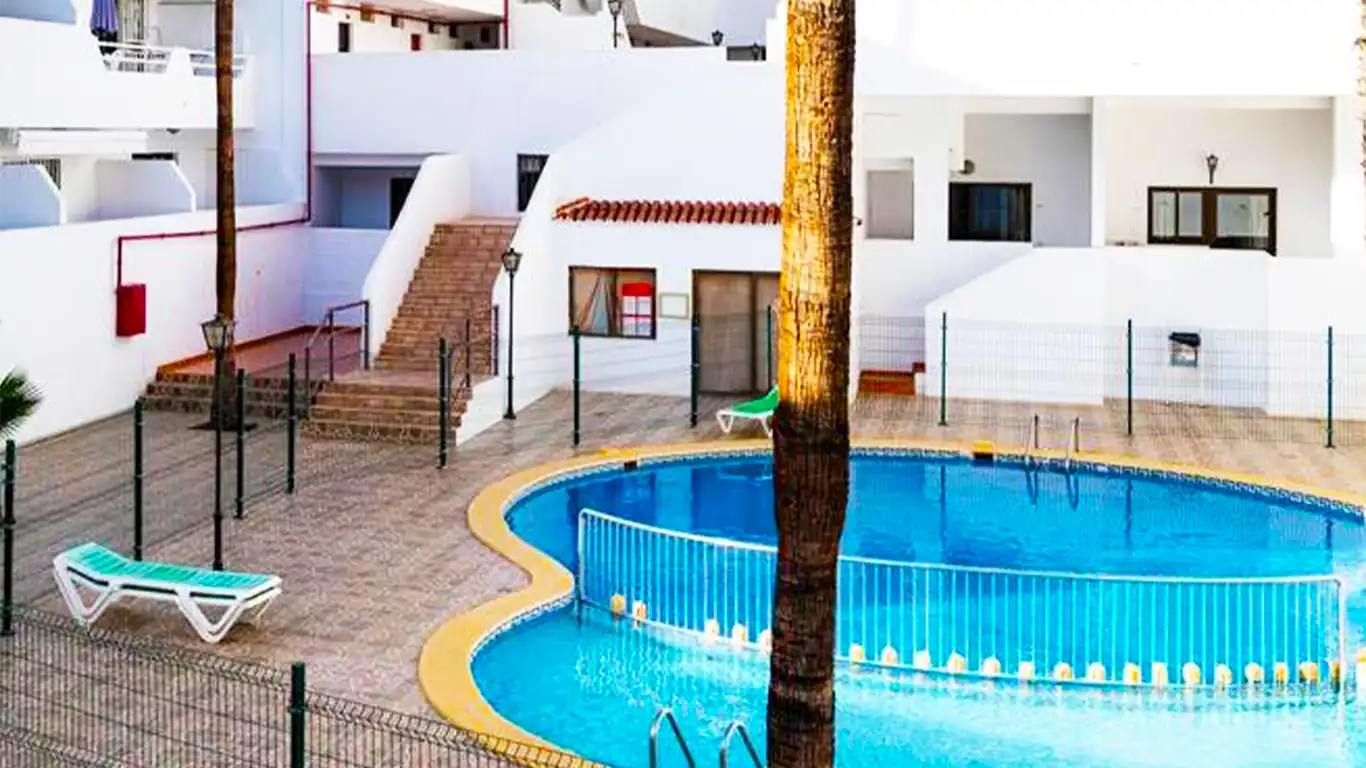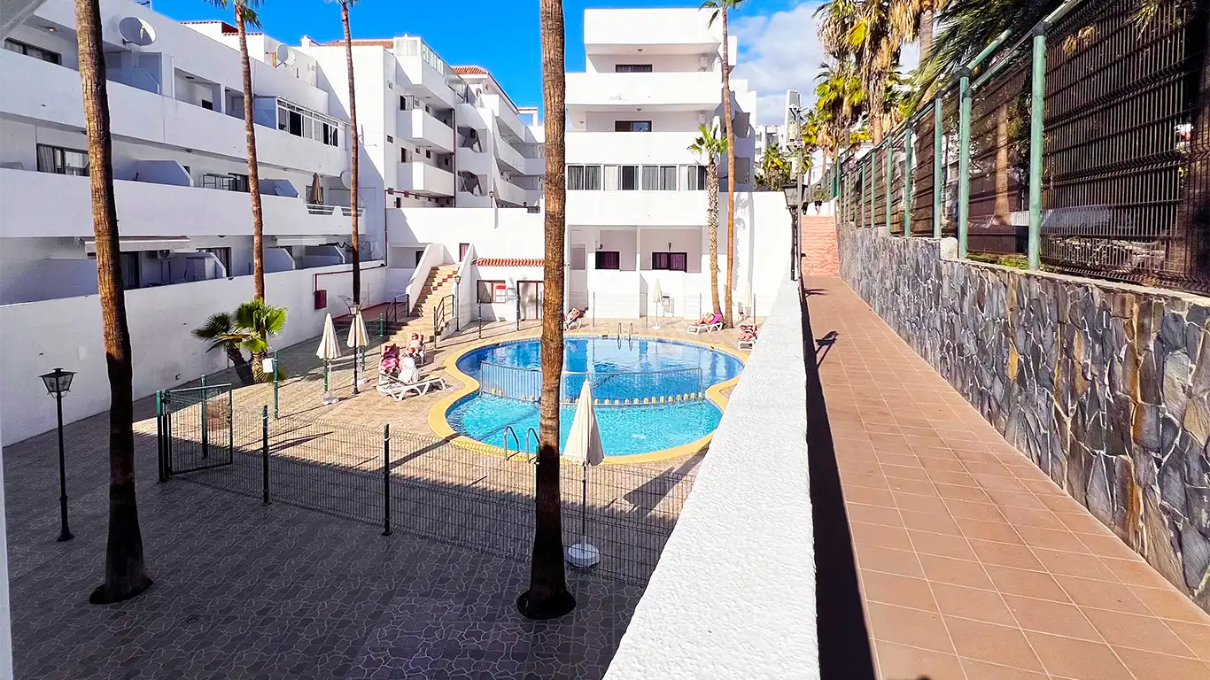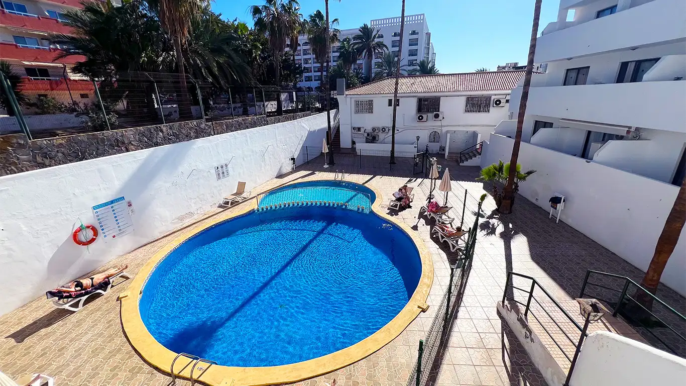 El apartamento dispone de un espacio funcional, cocina equipada, zona de descanso y un balcón con vistas a la piscina, ideal para relajarse y disfrutar del clima durante todo el año.